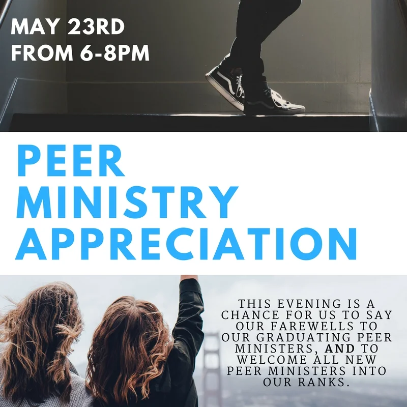 Join us for an evening of celebration and appreciation as we wrap-up another amazing year with Peer Ministry! This evening is a chance for us to say our farewells to our Graduating Peer Ministers, and to welcome all new Peer Ministers into our ranks.